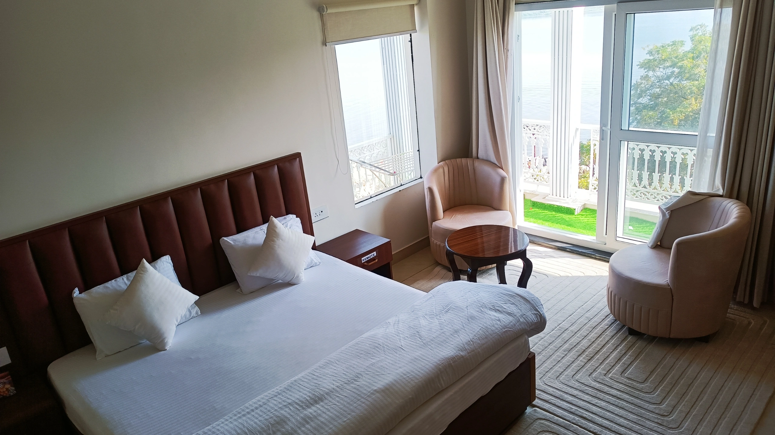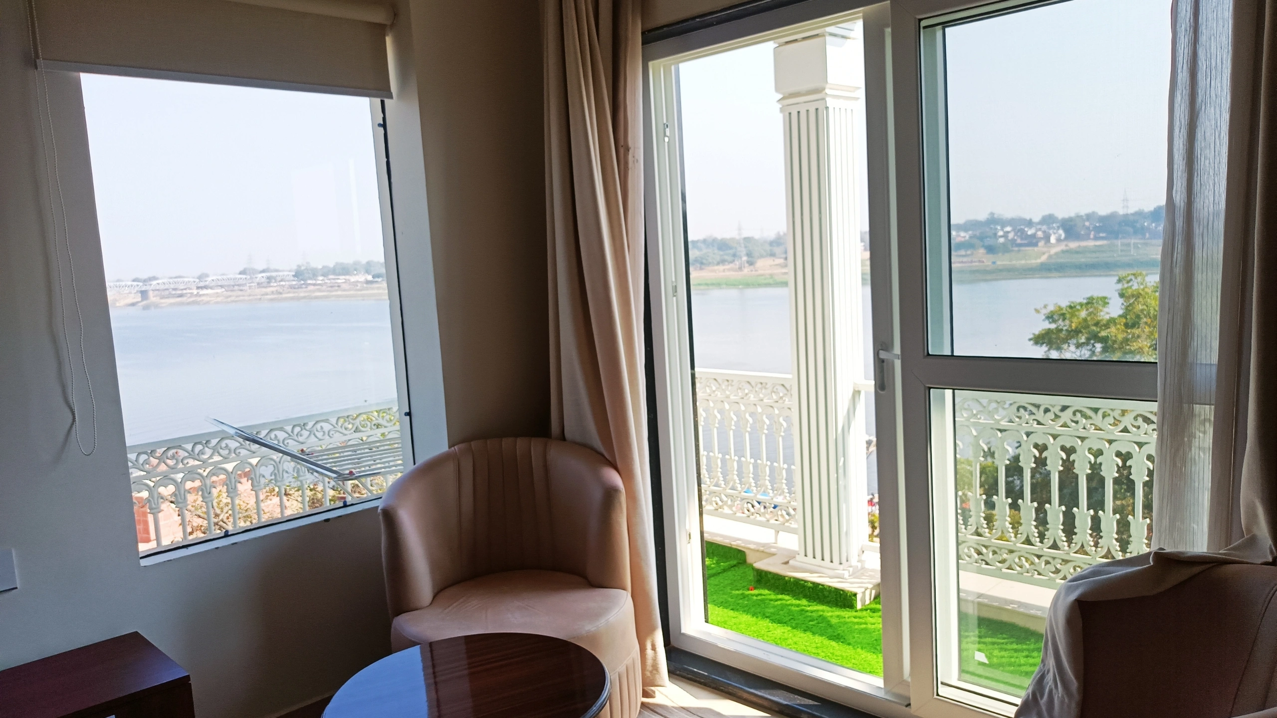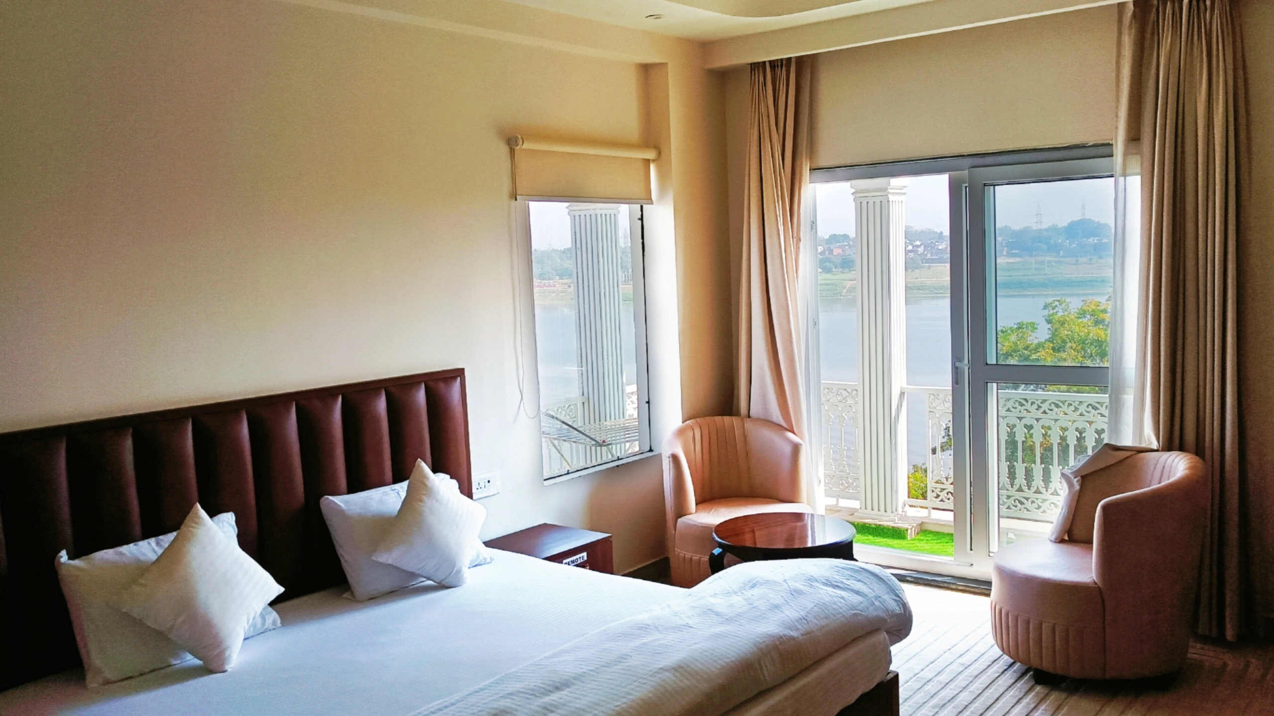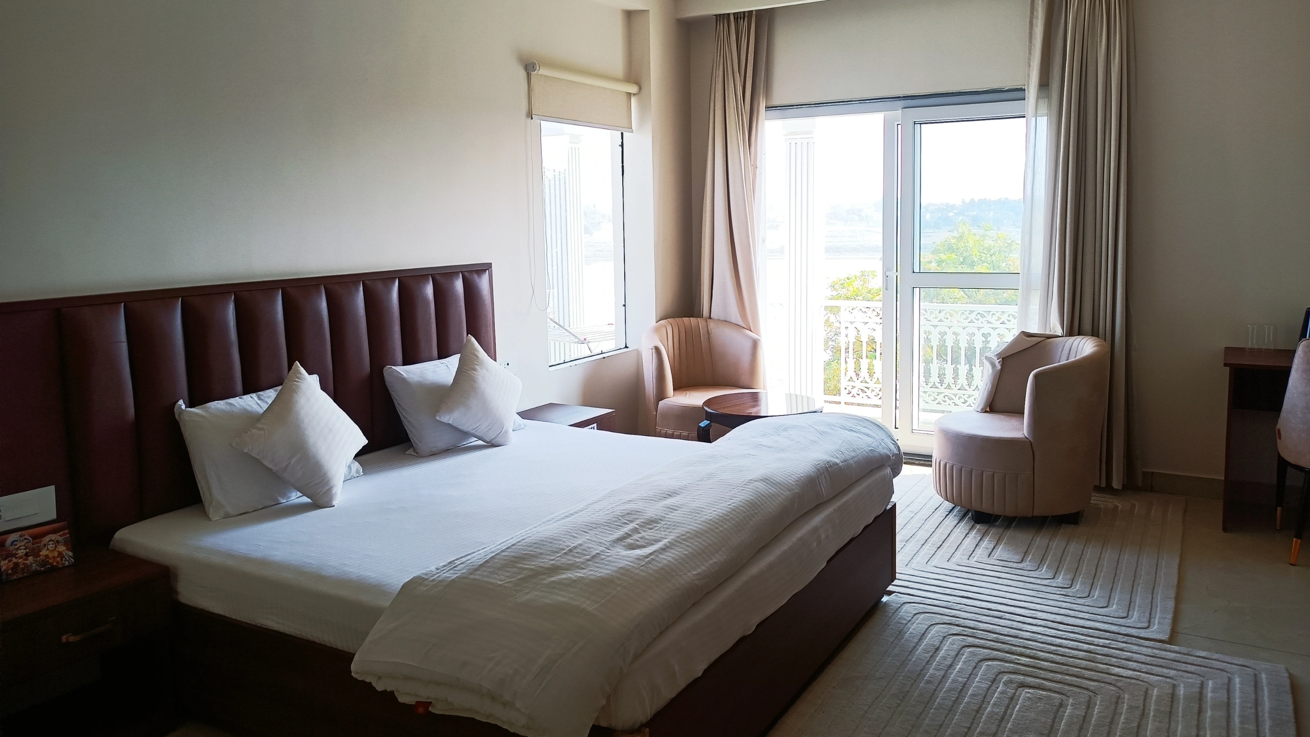 Guests enjoy panoramic views, soft ambient lighting, and a calm environment that supports rest and reflection after temple visits or spiritual activities. Every detail is thoughtfully arranged to ensure a comfortable and memorable experience, making it a preferred choice for those looking for a hotel in Prayagraj near Kumbh Mela with a peaceful, devotional setting.