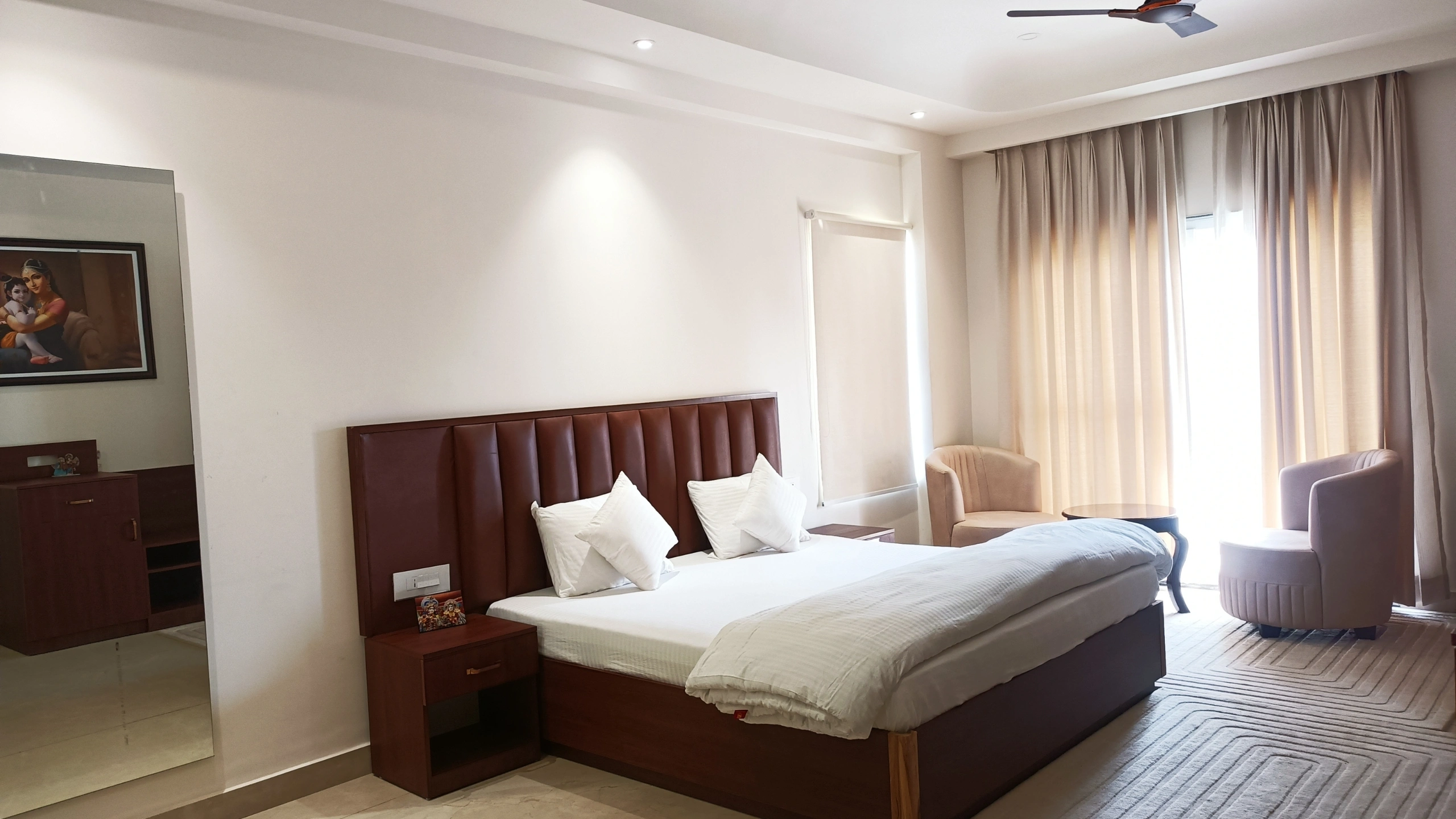 Our Luxury Rooms at ISKCON Guest House offer a premium and peaceful stay in Prayagraj, designed for guests seeking comfort, space, and spiritual calm. With elegant furnishings, spacious layouts, and soothing interiors, these rooms provide a refined accommodation in Prayagraj, ideal for devotees, families, and long-stay travelers.
